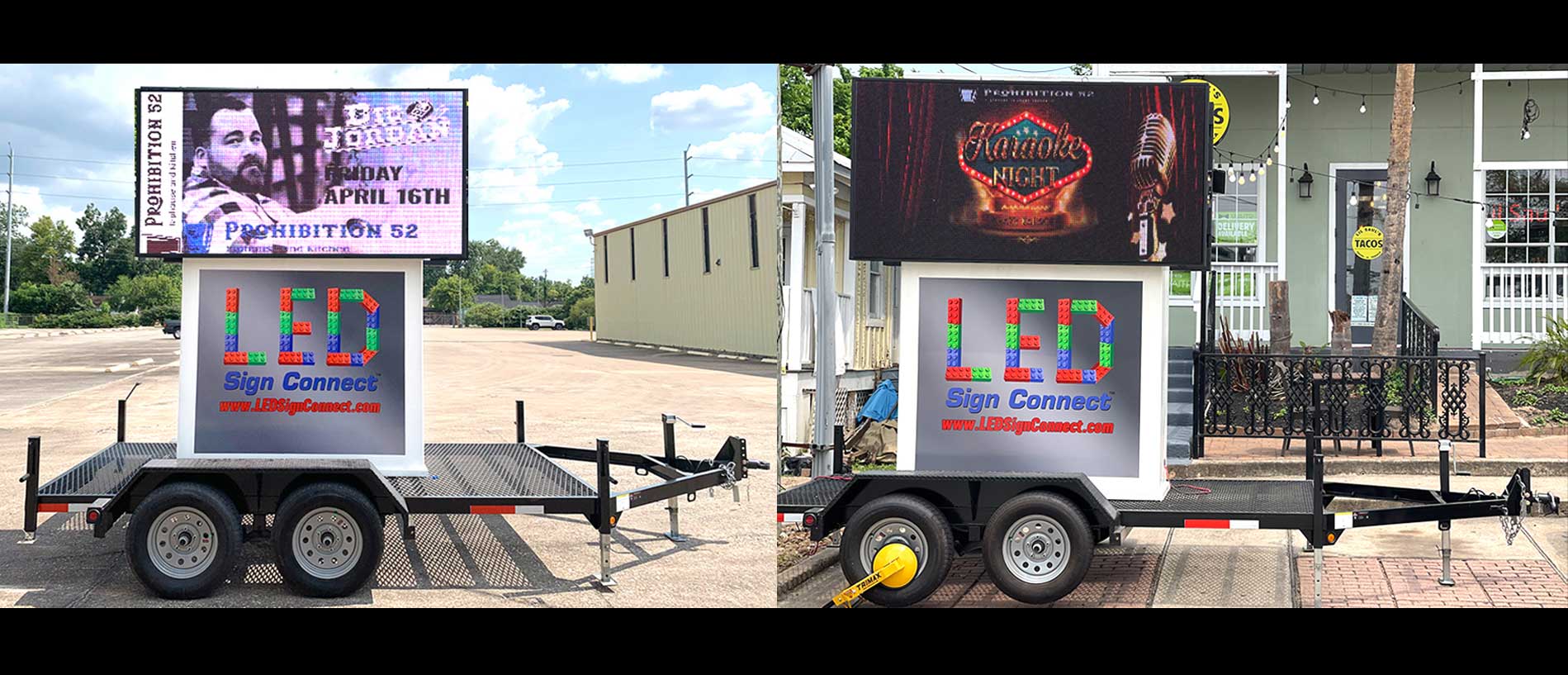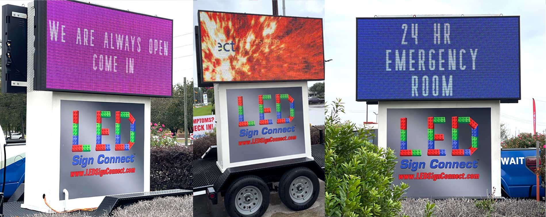 LED Sign Connect makes custom mobile LED signs, and LED trailers. Rent a mobile led sign trailer, or indoor LED sign for your next event, opening, concert, or festival. We custom build mobile led trailers to any size or specification. Indoor LED sign availbale for rental and sale. We have our two standard mobile LED Sign Sizes. 3x6 P 8, 4x8 P10, P6 DIP feet. Currently available in our Vegas HD series.